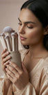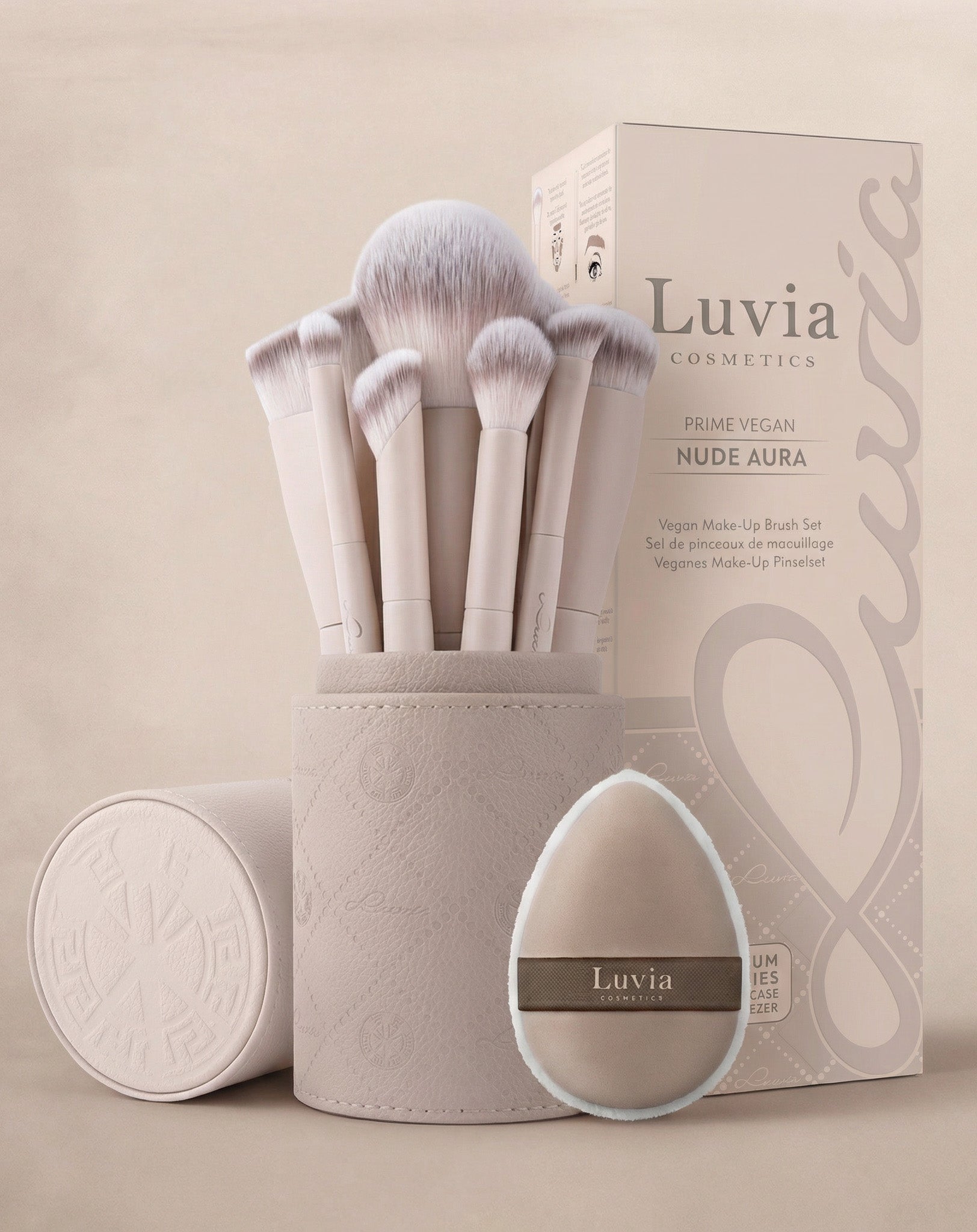 Das Nude Aura Make-up Pinselset vereint 10 perfekt abgestimmte Beauty Tools – 8 professionelle Make-up Pinsel für Gesicht & Augen, einen soften Powder Puff Sponge und ein ikonisches Etui aus veganem Leder.