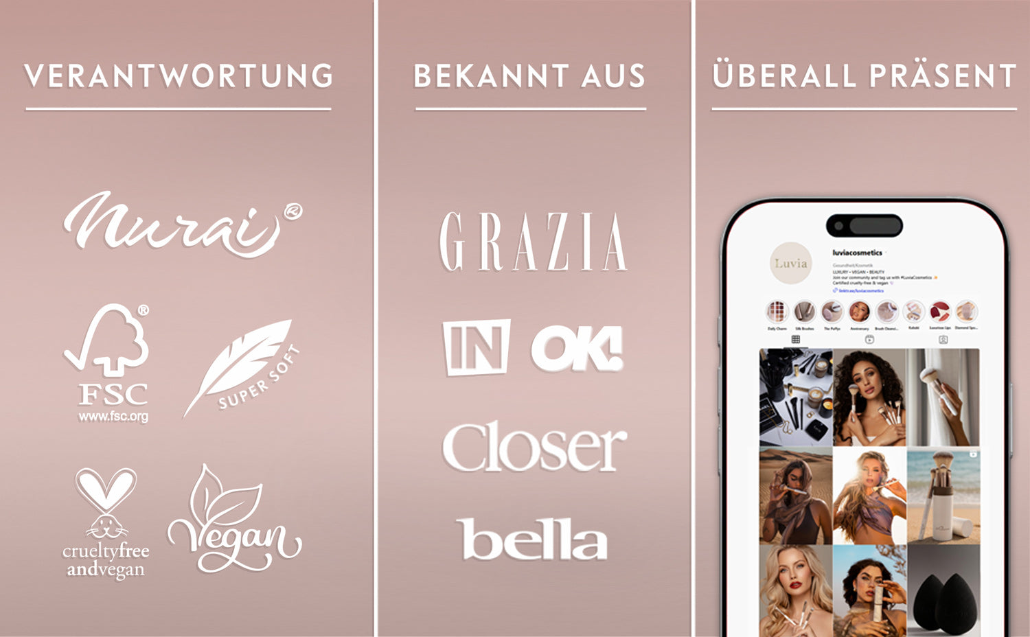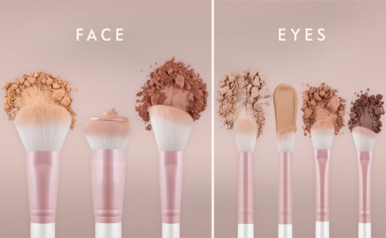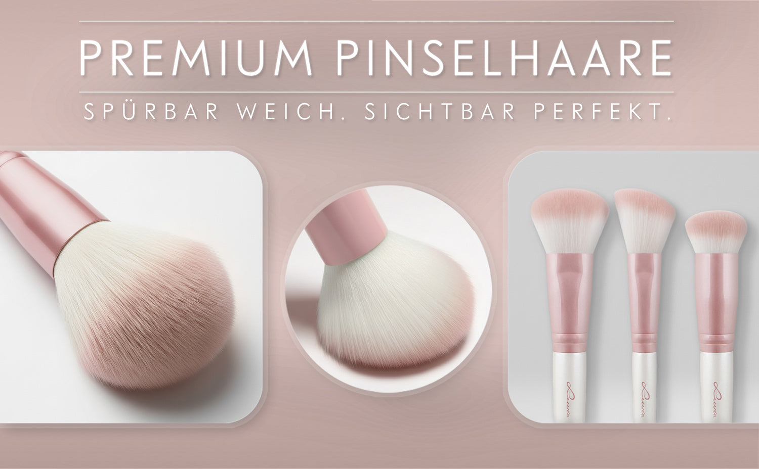 7 professional makeup brushes and a fine-pored sponge apply and blend any makeup product quickly and flawlessly. Our handmade brushes made of skin-friendly synthetic Nurai hair pick up the perfect amount of foundation, powder & co. and diffuse them precisely and evenly - for a smooth complexion and radiantly beautiful makeup results.Shimmering ferrules in candy pink and supple handles in pearl white round off the sweet but elegant design.